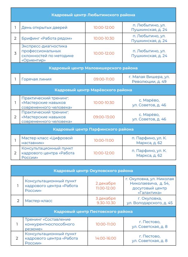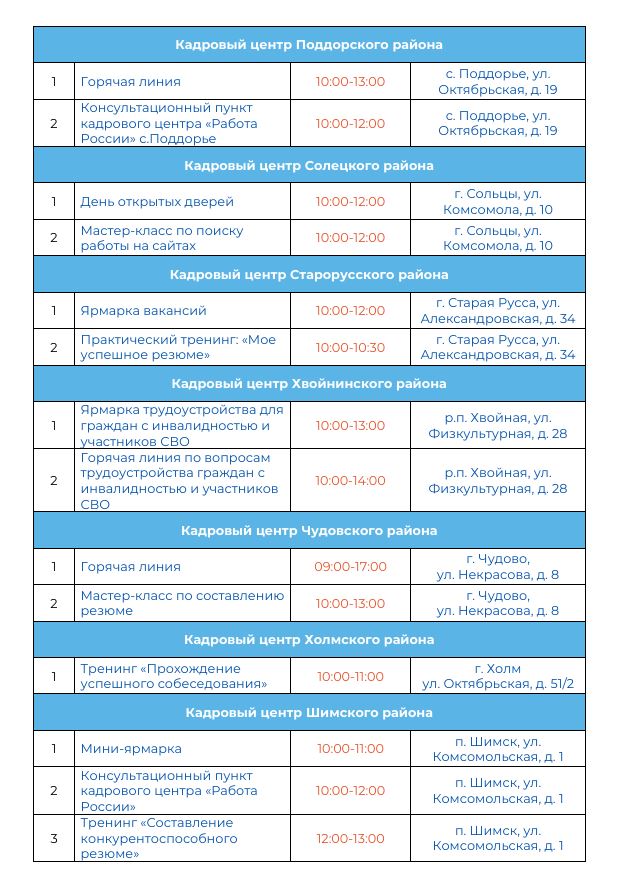 Для жителей Великого Новгорода и Новгородского района в Кадровом центре пройдет ярмарка вакансий с компаниями города, тренинг по профилактике профессионального выгорания, также будет функционировать консультационный пункт по вопросам трудоустройства и переобучения.