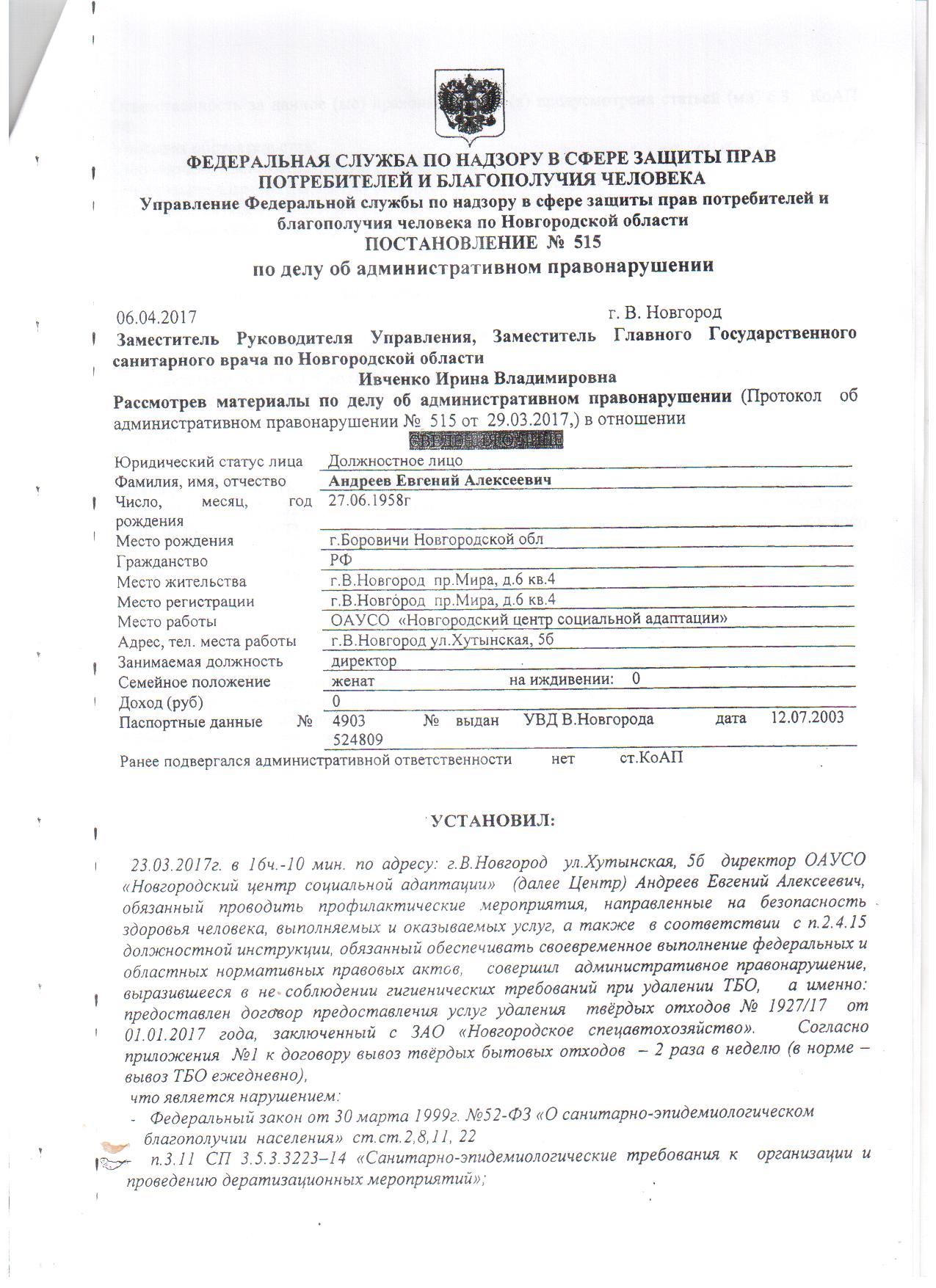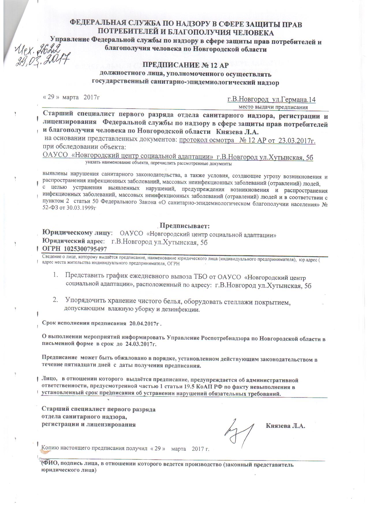 Проверка Управления Федеральной службы понадзору в сфере защиты прав потребителей и благополучия человека по Новгородской области. В ходе проверки выявлены нарушения санитарного законодательства, а также условия, создающие угрозу возникновения и распространения инфекционных заболеваний, массовых неинфекционных заболеваний (отравлений) людей (нарушены ст.ст. 2,8,11,29,32,36 Федерального закона 52-ФЗ от 30.03.1999 "О санитарно-эпидемиологическом благополучии населения"; Приказа №229 от 29.06.2000 МЗ РФ "О профессионально-гигиенической подготовке и аттестации должностных лиц и работников организаций"; п.п.3.5,3.7 СанПиН 2.1.7.2790-10"Санитарно-эпидемиологические требования к обращению с медицинскими отходами"; п.п.1.5., 2.4.,2.6.,2.7. СП1.1.1058-01 "Организация и проведение производственного контроля за соблюдением санитарных правил и выполнения санитарно-противоэпидимических мероприятий"; ст.25 Федерального закона от 07.12.2011 №416-ФЗ "О водоснабжении и водоотведении".
