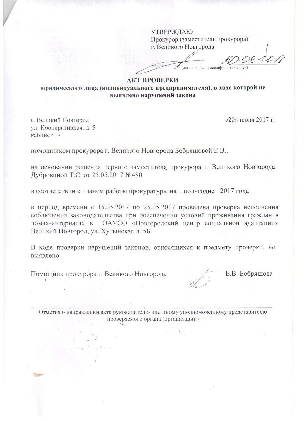С 15.05.2017 по 25.05.2017 Проверка Прокуратуры Великого Новгорода исполнения соблюдения законодательства при обеспечении условий проживания граждан в учреждении. В ходе проверки нарушений законов, относящихся к предмету проверки, не выявлено.