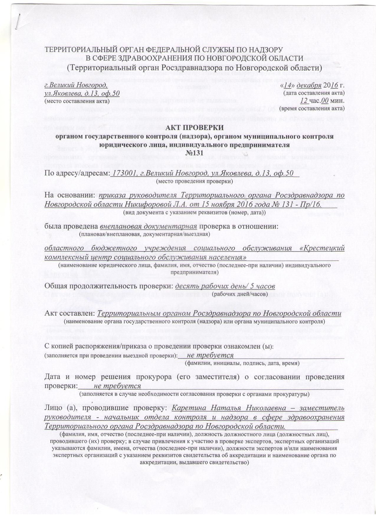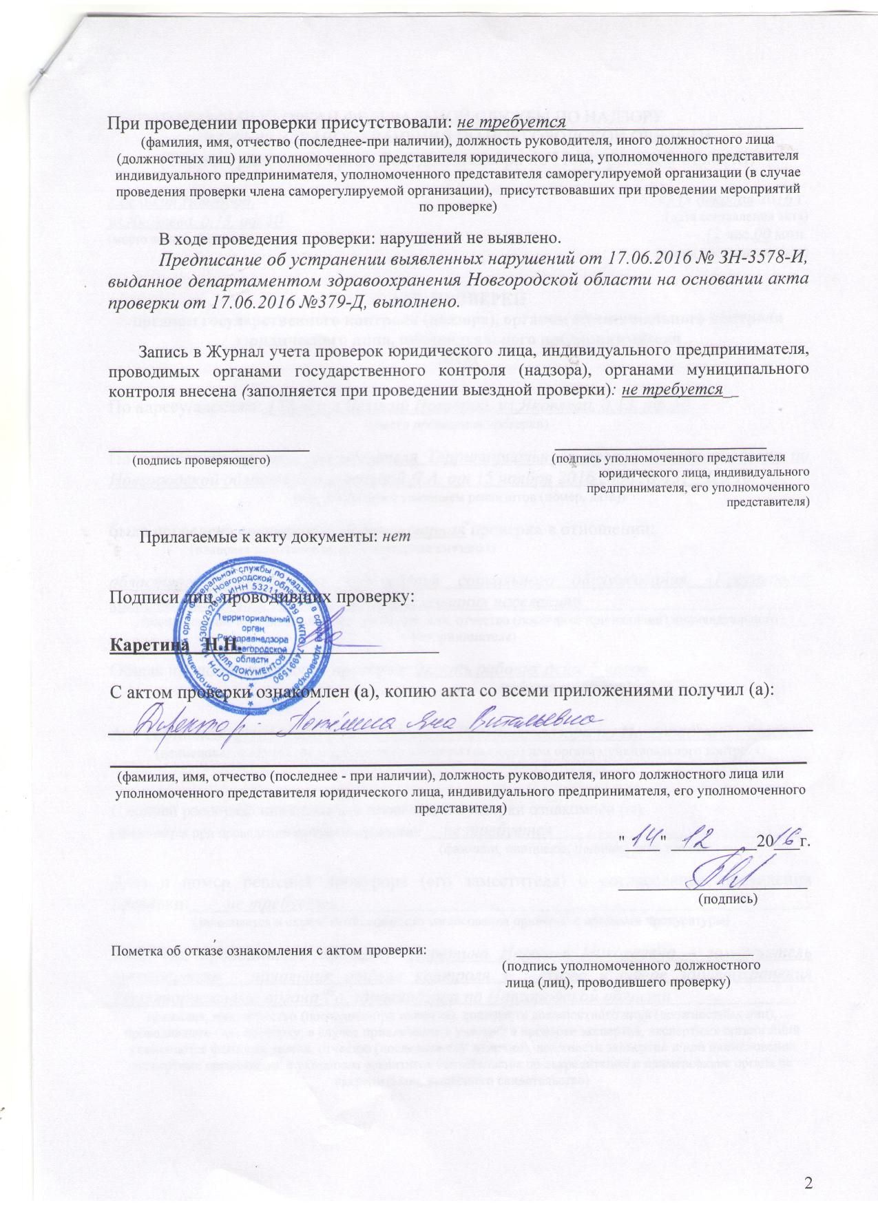 14.12.2016Внеплановая документарная проверка Росздравнадзора по Новгородской области. В ходе проведения проверки нарушений не выявлено.